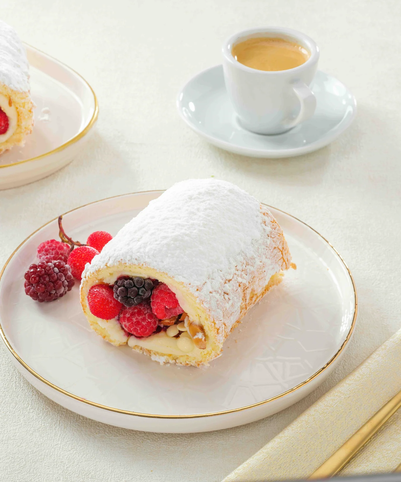 Egg white, corn flour, powdered sugar, milk, sugar, starch, egg, white chocolate, butter, liquid whipped cream, strawberry.